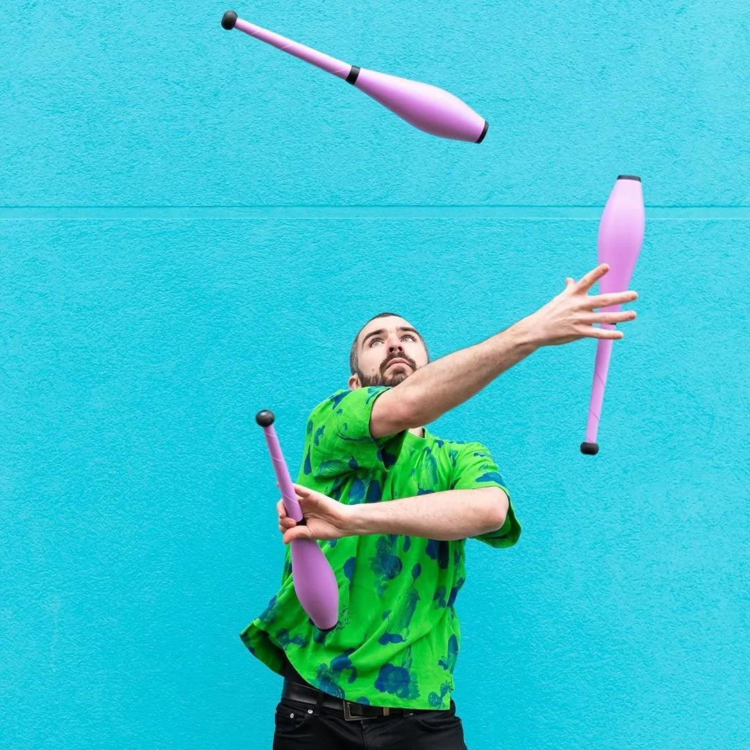 Wes Peden designs juggling to perform in space stations and parking lots. He has performed in over 25 countries including Japan, Chile, Australia, and Iceland. His energetic, complex, and playful juggling style has won him awards from the International Juggling Association and the festival Cirque de Demain. Wes takes inspiration from Sumo wrestling, fast-food packaging, and 1950´s playgrounds.