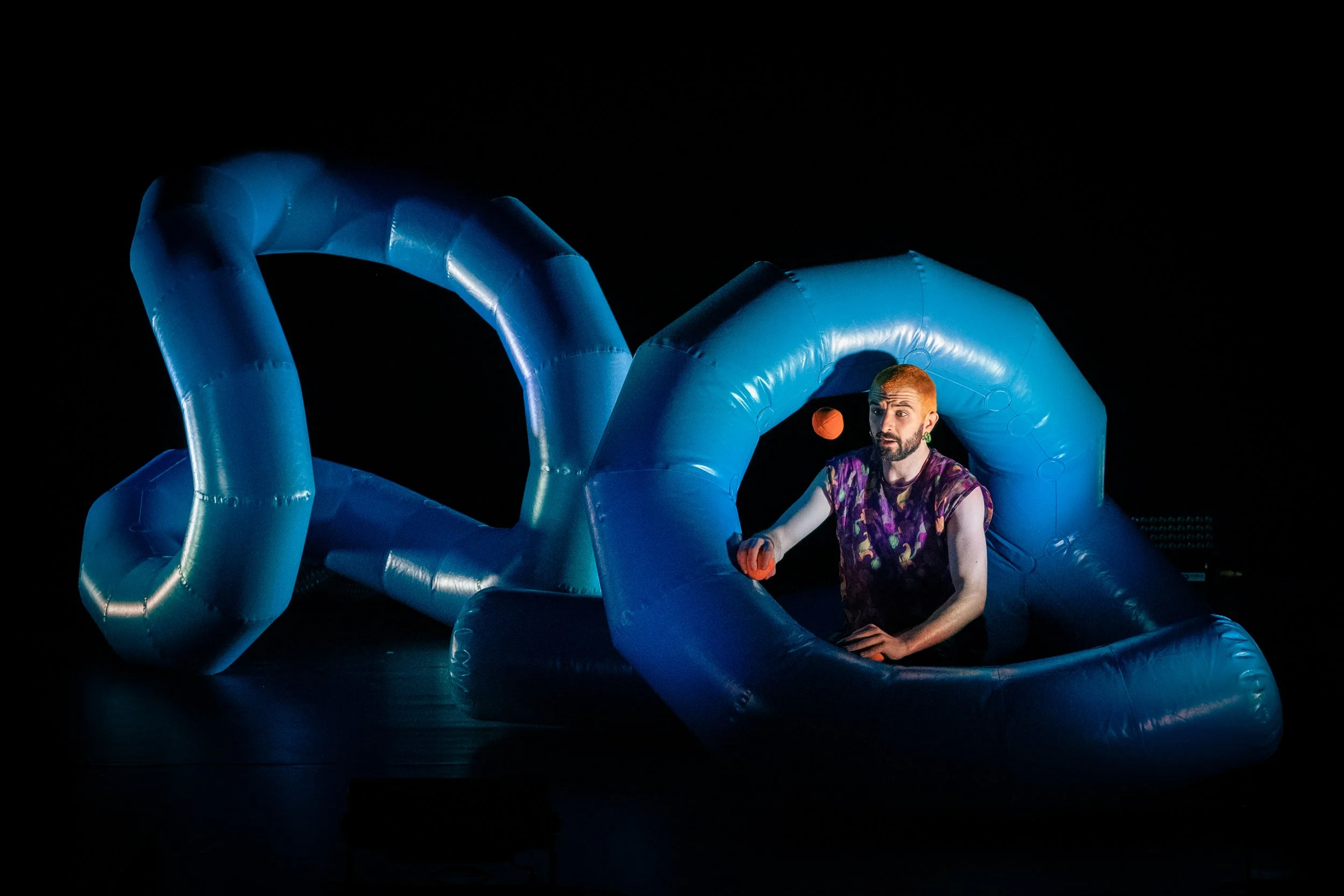 Surrounded by a huge inflatable pink structure and accompanied by electro beats composed of distorted rollercoaster sounds, Peden performs original tricks inspired by rollercoasters and their high-tech seatbelts. A spinning plate ceremony becomes a celebration of the great rides of the past; an epic 3 ball disco juggling evokes the evolution of rollercoasters; a 4-meter transparent tube turns into a path around Wes’ body to make balls flow through loops, helixes, and corkscrews. Rollercoaster twists theatrical rules to create a safe space to perform some of the most difficult and unique juggling ever done on stage!